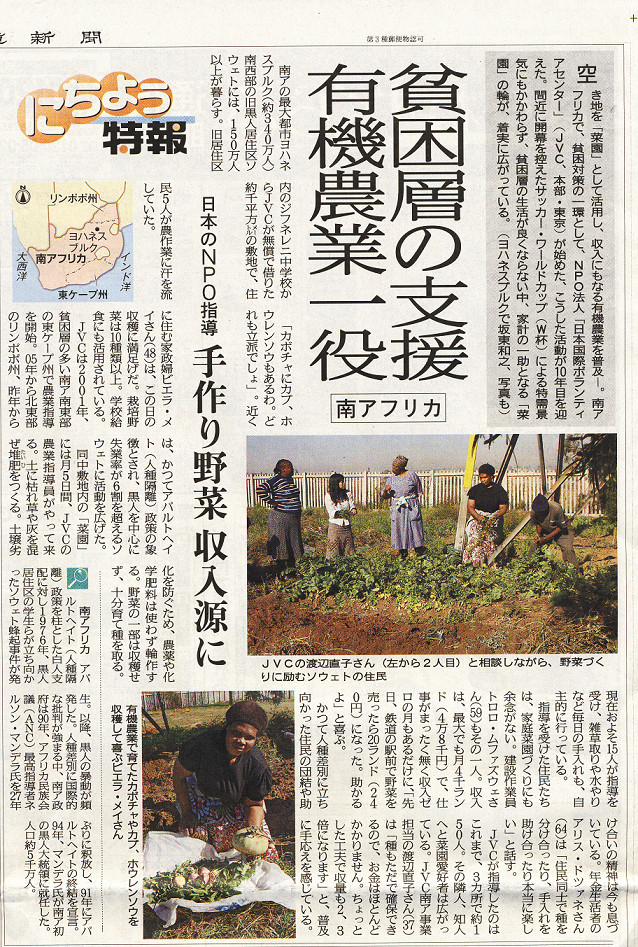 「南ア貧困層支援のNGO 野菜作り伝授自活手助け」にて、JVCの活動と南ア現地代表 渡辺のコメントが掲載されました。