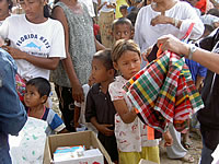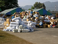 ■救援センターとなっているパーサ ーン寺に運び込まれた救援物資。 (12/31撮影) |