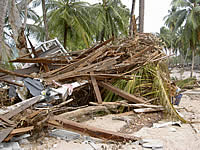 ■流された家屋の残骸がやしの木の もとに積み重なっている(プラトーン島、 12/31撮影) |