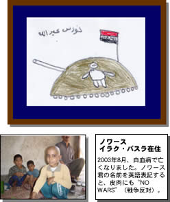 JVCはイラクでの医療支援の過程でたくさんの子どもたちに出会いました。彼らが描いた家族、友達、そして戦争・・・。画用紙いっぱいに描かれた子どもたちの絵は、たくさんのメッセージを伝えてくれます。