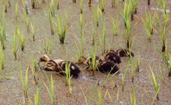 アヒル水稲同時作は、水稲栽培中に一定期間アヒルのヒナを水田に放す農法です。アヒルが雑草や害虫を食べるので、農薬や除草剤を使う必要もなく、農民の労働も軽減されます。また、アヒルの糞は肥料になり、アヒルが田んぼを泳ぐことで土壌が攪拌され、丈夫な稲が育ちます。多くの場合、米も増収します。
