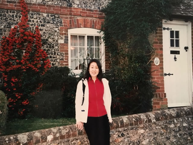 A photo taken in front of a house in the neighborhood, when she stayed in U.K. as a graduate student. Brick houses are very chic!