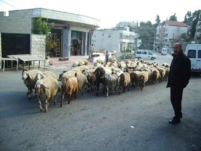 A photo taken in her student days in Palestine. A number of sheep are marching in front of houses. It is a poetic scenery.