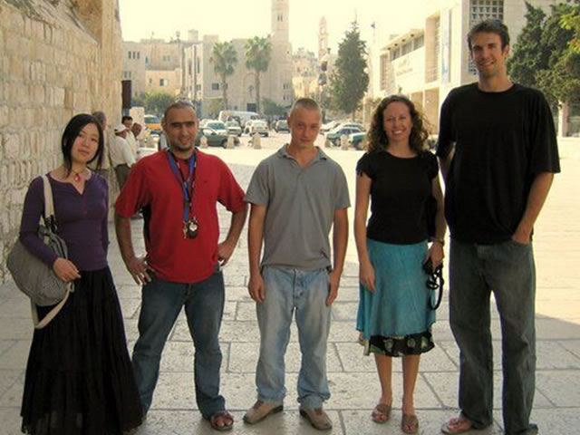 In front of the Church of the Nativity in Bethlehem together with her friends. The number of friends increased as her Arabic improved.