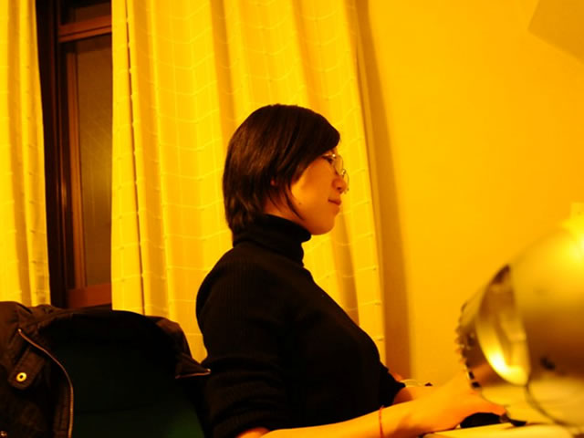 A photo when she worked in a company. After leaving the company of clicking donations, she did many kinds of jobs like factory worker, assistant to a professor of a graduate school, and so on.