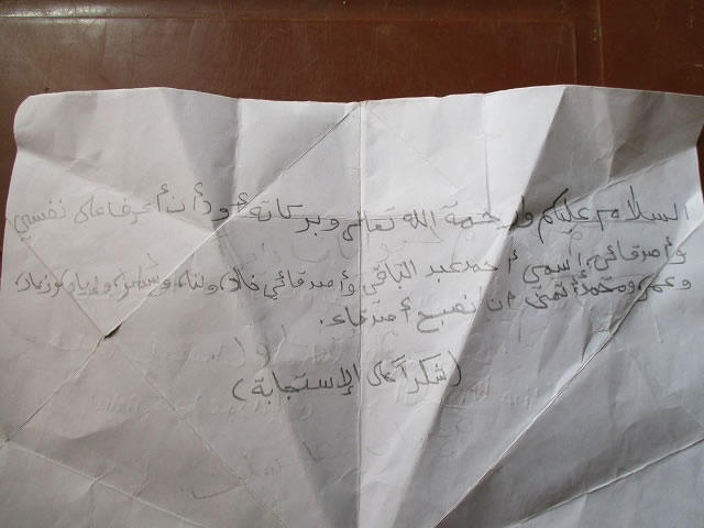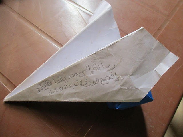 One day, on the weekend, when I was hanging laundry in the balcony, I heard my name getting called “HIKO” as usual. Since Hashimoto’s Arabic has become a little more comprehensible recently, we exchanged a few words. Then suddenly, I came up with an idea: “if I fly a paper plane from the second floor, it will fly well”. From my experience as a nursery teacher, I was convinced that the children would be delighted with my idea. I immediately made a high-performance paper plane, an object on which I studied a lot while I was working at a nursery school, and flew it toward the children. They jumped for joy as I had expected. Later I was doing my work, thinking that the paper plane might have lessened our distance, when I heard the front door-chime ringing. As I opened the door, I found at my feet the paper plane I flew a little while ago. As I picked it up, I noticed some Arabic writing on the plane. “Dear our friend HIKO. Please open this paper and read the letter inside.”