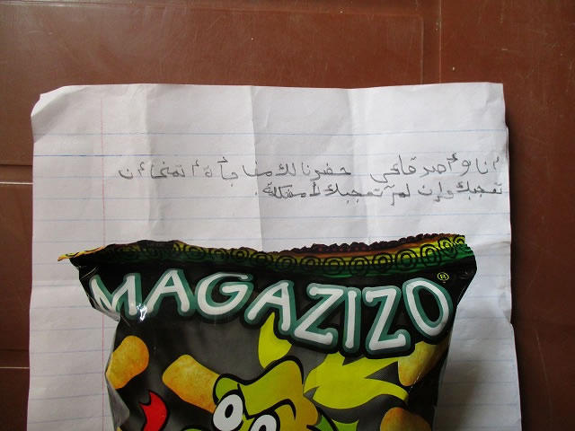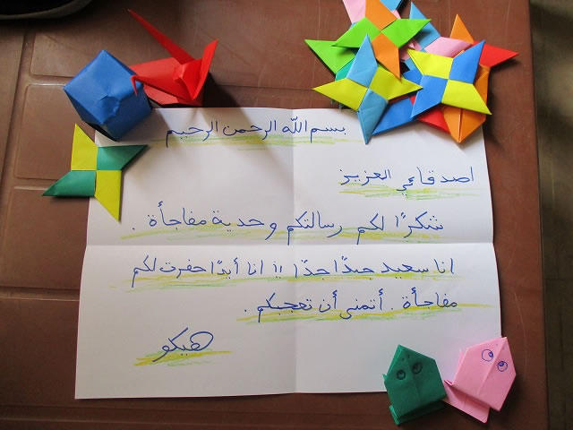 “Dear HIKO. This is a present from us. We will be happy if you like it.” Although I wondered if I should accept a present from children, I received their goodwill with gratitude. Now it was my turn to return the favor to the children in a proper way, and there were more than 10 children at that. Once again, my past experiences at a nursery school helped me to solve the problem. I decided to fold origami paper and make a lot of origami works such as a shuriken (a small throwing blade), a crane, a jumping frog, and a paper balloon. And I wrote them back in Arabic: “Dear sweet friends. Thank you for your present and letter! HIKO is so happy to receive them. HIKO also wants to give you presents. I hope you will like them.”
