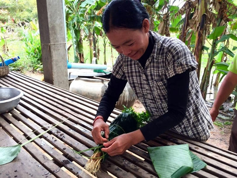 At first they thought that it would be more stylish to use plastic wrapping when selling in the city. But when I showed an article on the Web and explained that using banana leaves is the latest packaging style, they said, “That’s so interesting!” and agreed to use banana leaves. Since banana leaves are commonly used to steam rice sweets, they thought it was inappropriate to use them for ‘high-end’ packaging. To those who live in the city or in Japan, don’t you think banana leaves are more attractive as packaging materials? You will see how ordinary life in the village can be very appealing if you change your perspective just a little. I hope to tell about this to the people in the project site much, much more.