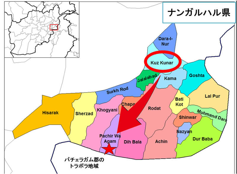 A map of Nangarhar province. Our project area, Kuz Kunar district, is circled by red. The red star shows the location of Tora Bora.