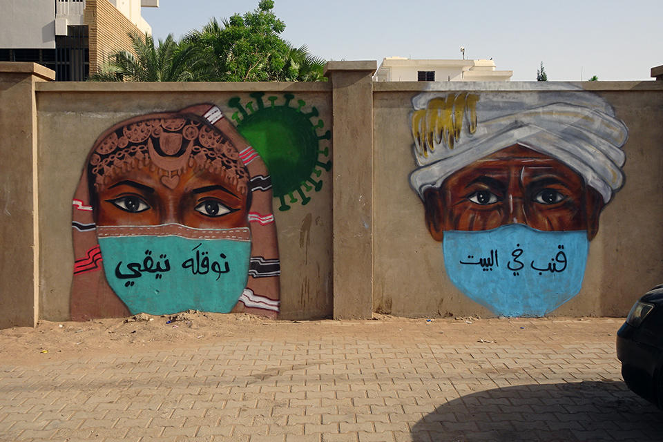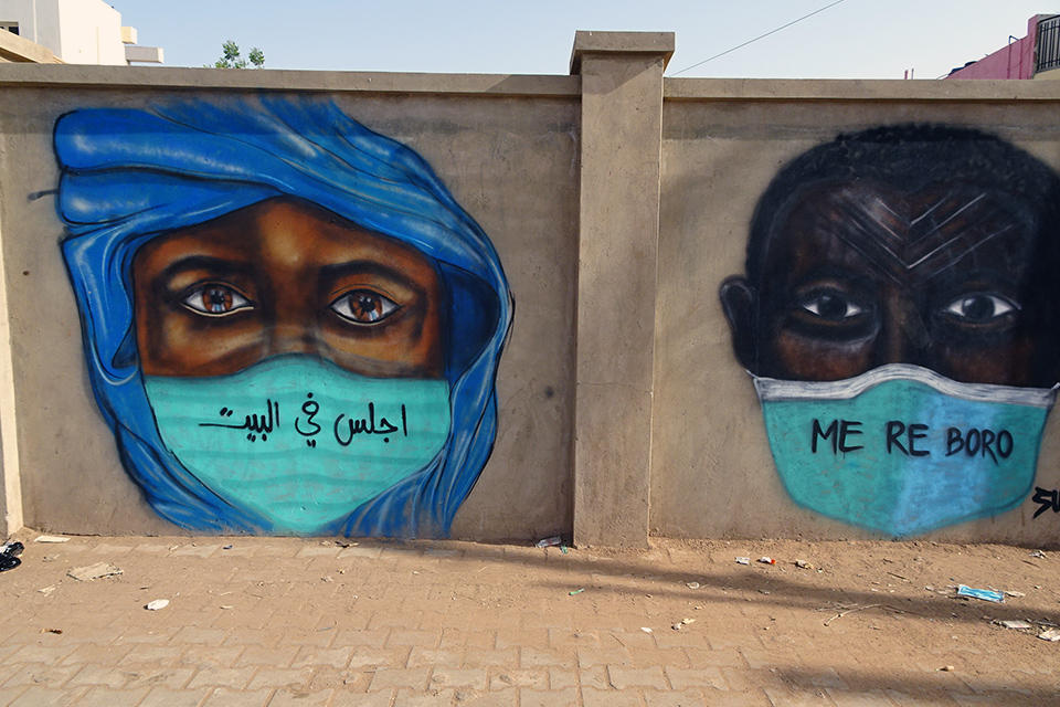The words “Stay at home” are written in different languages on masks because Sudan consists of various ethnic groups.