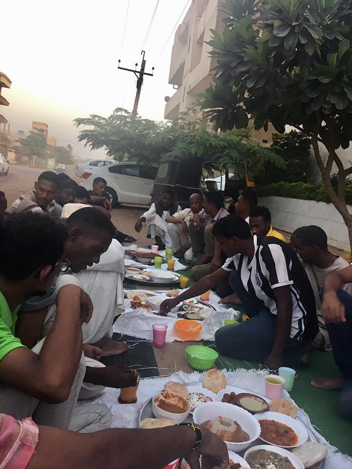 During Ramadan last year. It is a culture in Sudan to sit along the road and eat together during Iftar (a meal after fasting). This year’s Ramadan began from April 25th and there were people sitting along the side of the road and eating together as usual.