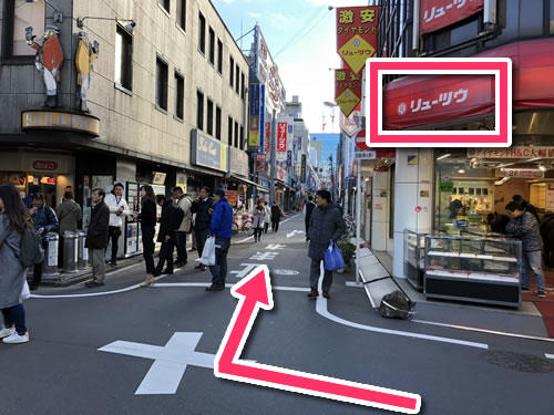 7. 真っすぐ進みます。右手に「リューツウ」という赤い看板のお店が見えます。