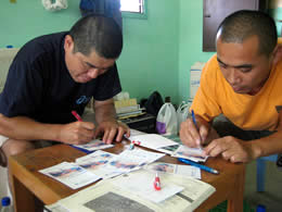 机の上をよぉく見ていただくと、ハガキらしいものが見えます。これは最近、スーダン事業へご寄付をいただいた方へ、駐在員の岩間と井谷がお礼状を書いているところです。
