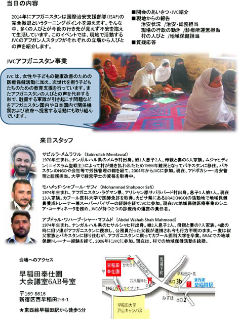 JVCアフガニスタン事業は、現地のジャララバード事務所よりスタッフが3名来日し、それに合わせた報告会を開きます。