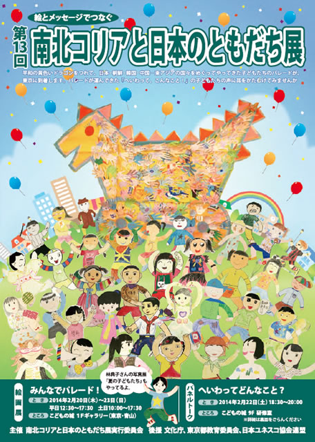 『南北コリアと日本のともだち展』は、わたしたちの住む北東アジア地域の平和をねがう催しです。2001年より、大韓民国・朝鮮民主主義人民共和国・日本そして在日コリアンの子どもたちの絵を、ひとつの会場に展示し、絵でお互いを紹介しあってきました。
