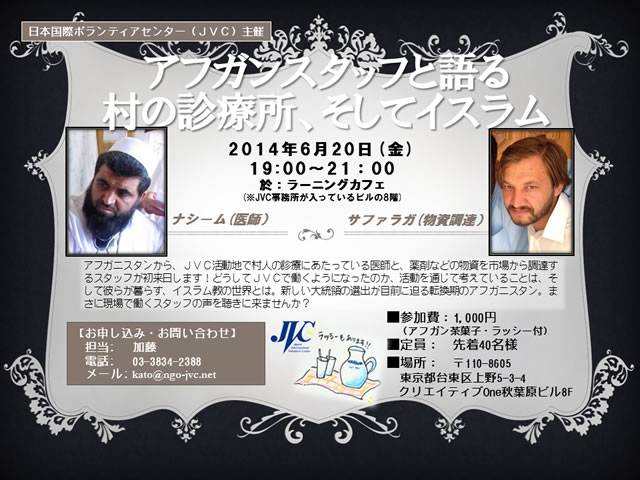 アフガニスタンから、活動地で村人の診療にあたっている医師と、薬などの物資を市場から調達するJVCスタッフが初来日します!
