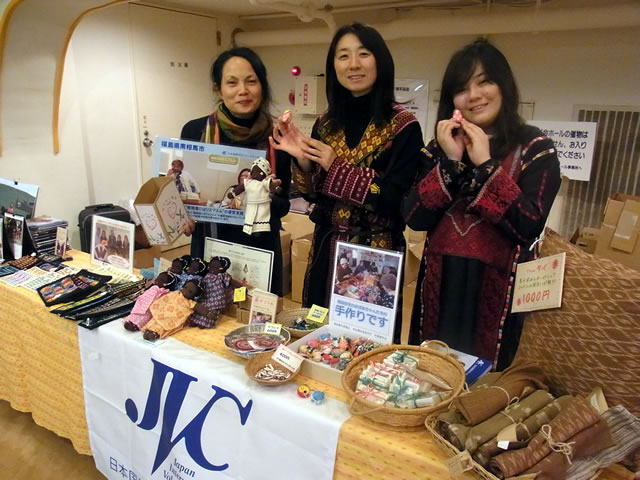 歌手生活50周年を迎える加藤登紀子さんの「ほろ酔いコンサート」会場(北海道を除く)で、JVCカレンダーやパレスチナ、南アフリカの雑貨、気仙沼のおつまみこんぶなどの物品販売をしています。また、JVCを含め国際協力や被災地支援活動に取り組む団体の募金をよびかけています。