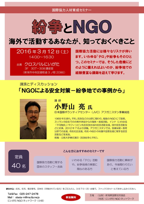 | プログラム | 講演とディスカッション「NGOによる安全対策~紛争地での事例から」 ![]() 講師 小野山 亮 氏 1969年生まれ。平和、民族などの分野に関わり、複数のNGOにて勤務。 |