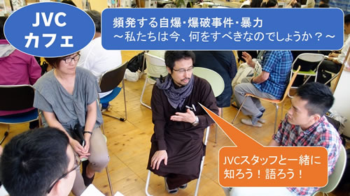 JVCのイラク、パレスチナ、アフガニスタン事業の担当スタッフが、答えになっていないかもしれない感情も含めて、多くの皆さまにお話したく、また皆さまのの思いもおうかがいしたく、以下のようなトークの場を設定いたしました。