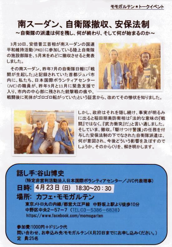 3月10日、安倍首相が南スーダンPKOに参加している陸上自衛隊の施設部隊を、5月末をめどに撤収させると発表しました。南スーダンの首都ジュバに職員を派遣し、緊急支援を行っていたJVC代表谷山が、現地の最新情勢を踏まえながら、自衛隊撤収、安保法制についてお話します。