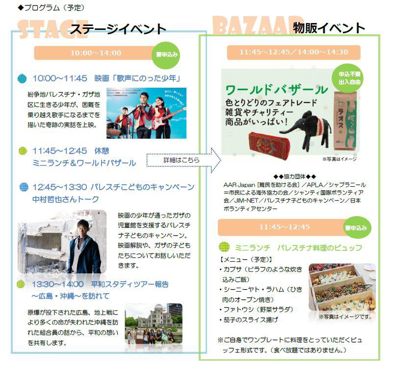 今年はパレスチナ・ガザ地区に生きる少年が、困難を乗り越え歌手になる夢を叶えるまでを描いた奇跡の実話「歌声にのった少年」上映とパレスチナの教育支援などを行うパレスチナ子どもキャンペーンの中村さんのトークがメインプログラムで、JVCは上映会・ランチ後に開かれる「ワールドバザール」にて各国クラフト雑貨の販売をします。