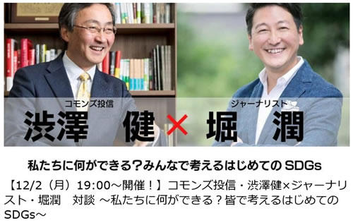 社会全体でSDGs達成に向けて取り組みを加速させることを目的に、トークイベント「コモンズ投信・渋澤健×ジャーナリスト・堀潤 対談~私たちに何ができる?皆で考えるはじめてのSDGs~」を実施します。
