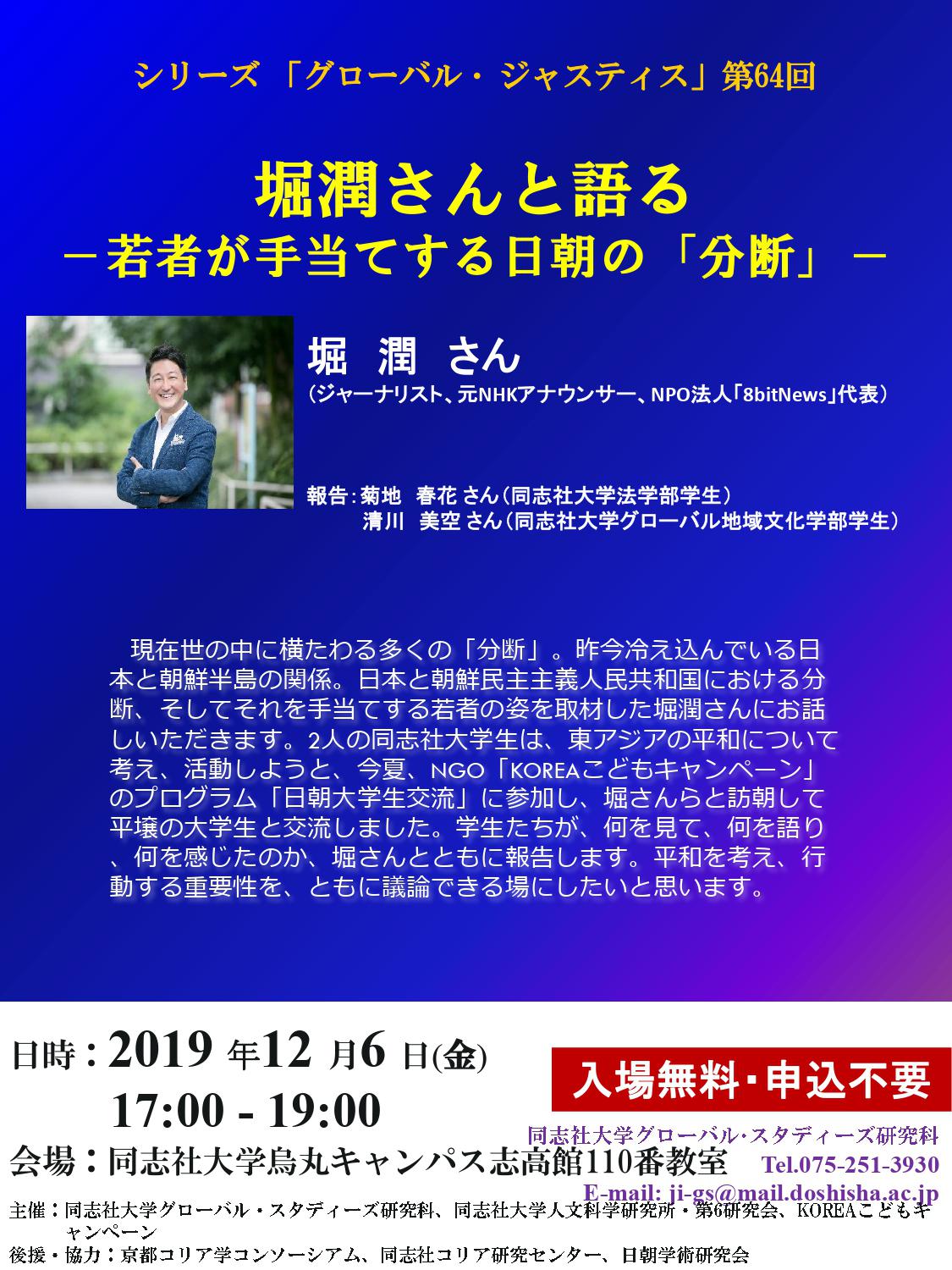 第64回目の今回は元NHKアナウンサーで、現在はNPO法人「8bitNews」代表を務める堀 潤 氏を講師に招き、「堀潤さんと語る-若者が手当てする日朝の「分断」-」を開催します。入場無料、申し込み不要となっておりますので、ぜひ告知、取材いただけましたら幸いです。