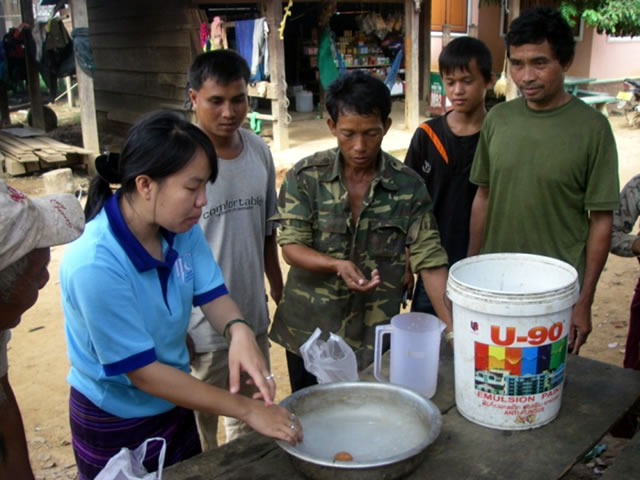 森の豊かな自然資源も大切ですが、村人の主食はやはり米。世界でも珍しいもち米が主食のラオスですが、その味は絶品です。写真は塩を使った丈夫な種籾の選別方法の研修風景です。こうしたことを村人に伝えることで、特殊な資材や機械を使わなくても米の収穫量を増やすことができるようになります。