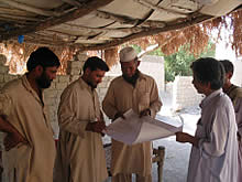 白い帽子はコーティー村の保健員ヌール・モハンマドさん。地域保健トレーナーのワハーブ職員と谷山前現地代表が村の地図を見ながら説明を聞きました。