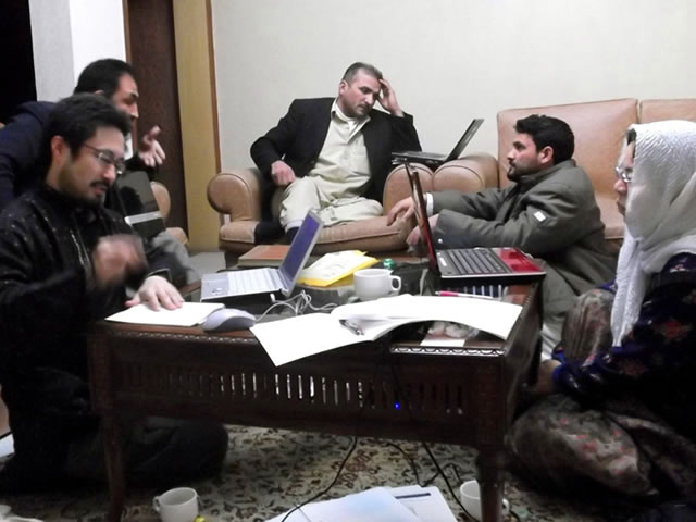 さて午後からは、JVC事務所があるアフガニスタンのジャララバードから車を乗り継いでやってきた現地スタッフが合流し、早速打ち合わせに入りました。滞在時間が限られているので、長旅でお疲れのところ申し訳ないと思いつつも、まずは予算のお話に着手しました。この会議も長引き、すっかり外も暗くなり、それでもまだまだ終わらない...