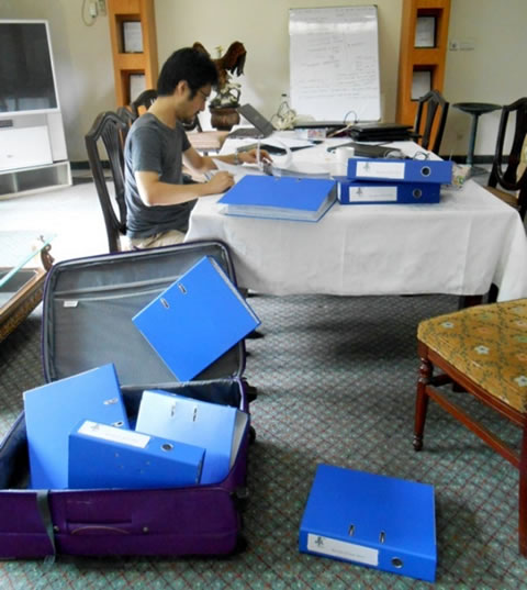 小野山統括は全体の責任者として、現地・ジャララバード事務所で日々発生する領収書のすべてに一つ一つ目を通し、サインをしなければなりません。数カ月に一度、会計担当者がたまった領収書を出張で持参し、小野山がサインし、また現地事務所に持ち帰るというのが慣例となっています。領収書は毎日毎日出るので、その量たるや...