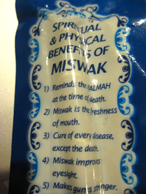 ミスワックはどんな歯ブラシよりも健康的な歯磨きツールです。みかけはただの木の枝ですが、端っこをしばらく水に浸しておくと繊維がほどけてブラシ状になります。これで歯をこするのです。東南アジアから北アフリカに至るイスラム諸国で広く使われています。来日したアフガンスタッフも、ちゃんと"マイ・ミスワック"を服のポケットに入れていました。必需品のようです。