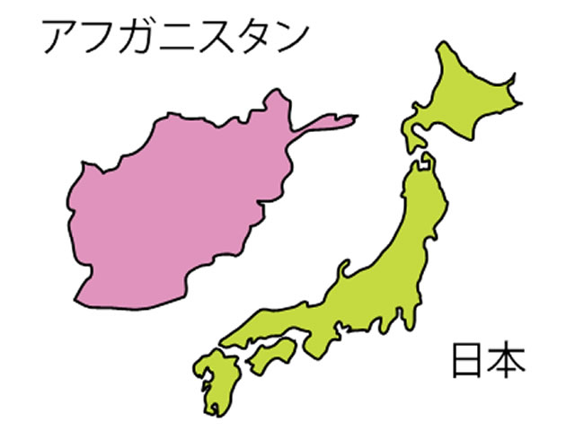 アフガニスタンは日本の本州と同じくらいの長さで、面積は約1.7倍あります。国土の半分は標高2000m以上の山地で、ヒマラヤ山脈に続くヒンドゥークシュ山脈が北東に向かって伸びています。山から流れる雪解け水は、いくつもの川となって低地に流れ込み、川の流域に豊かな緑の大地が広がっています。荒れた土地のイメージが強いアフガニスタンですが、川の周辺では小麦や野菜、果樹などがさかんに栽培されています。JVCの活動地がある東部のナンガルハル県(県都ジャララバード)は「アフガニスタンの食料庫」とも呼ばれており、様々な作物が収穫できます。