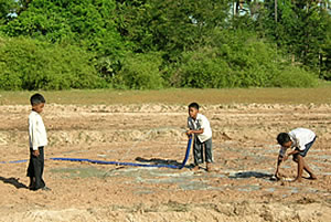 村の子ども達は、いつも家で田植えを手伝っていますが、7月下旬、新しいSRIのやり方で田植えを行ないました。田んぼの土を平らにする、良い苗を選ぶ、苗と苗の間を30cmほどあけてまっすぐに植える、などSRIの重要な手法を一つ一つ、子どもたちは体験しました。