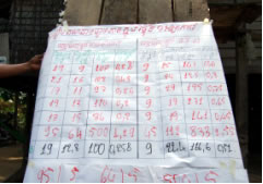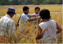 今年度、私たちの研修を受けてSRIを始めて見たという農家も収穫を始めたもしくは一部はもう終わってしまったというところが大半です。11月号の「相互訪問研修」の記事で取り上げた西タタオク村のヴィーさんの田んぼも収穫を迎えました。ヴィーさんが今年SRIを試した田んぼには「ニエイ・コン」という品種で中稲‐晩稲の品種で12月下旬頃から収穫を迎えます。そこで今回は、ヴィーさんの田んぼでどれくらいSRIと従来のやり方で差があるのかを比較するために、収量比較調査研修というものを実施しました。