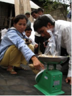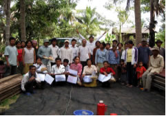 12月25日のクリスマス、相互訪問研修と同じく東タタオク村の農家も招いて研修を行いました。研修は集まったメンバーを5つのグループに分けて、それぞれSRIの田んぼと従来の田んぼの1カ所(1m×1m=1�u)ずつを稲刈りします。その1�uの収穫量でどれくらいの差があるのか、また1ヘクタール(10000�u)あたりの収量はどれくらいになりそうなのかの予想を見ます。