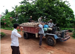 タヤエクコミューンの村を訪問し終え、事務所に帰る際に何やら物体をトラックに一生懸命積んでいる光景が目に入りました。150kgが量れる秤で、次から次へとかごに乗せ、量り終わった物体たちがトラックに乗せられていきます。