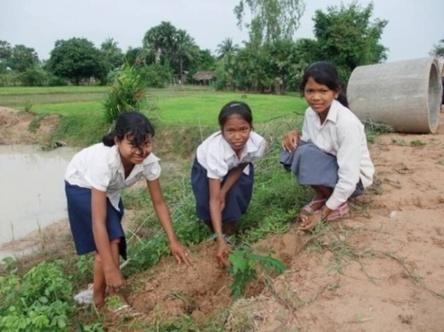 今回、植林キャンペーンの舞台となったのは、JVCの活動地であるシェムリアップ県ソトニコム郡ダプカ村です。アンコールワットで有名なシェムリアップから車で1時間半ほどのところです。植林キャンペーンでは、村内の道路沿いなどに児童と地域の人びとが植林を行います。地域の人々が木を植え、活用できる自然資源が増やすことは、将来への大切な投資であるといえます。また、木が増えることで温暖化の原因となる二酸化炭素を吸収したり、蒸散作用によって木の葉が水分を空気中に放つことで、空気が冷やされたりと、地球温暖化対策にもつながります。そして何よりも、道路に木陰ができることで、毎日、炎天下を徒歩で登校する子どもたちが涼む場所を提供することができます。