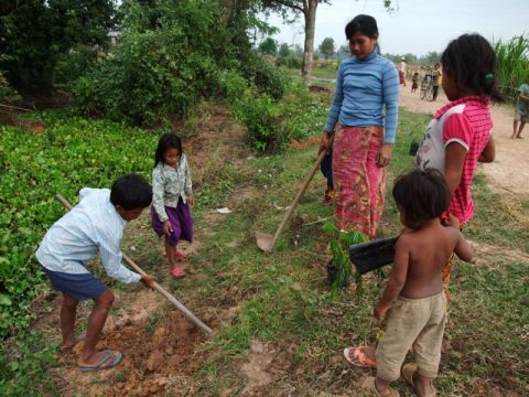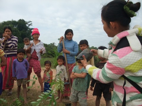 12月14日、コークトゥローク地区(コミューン)のタプニア村で植林が行われました。カンボジアの家々は道沿いに建てられていることが多いのですが、その家々を結ぶ村の幹線道路(とはいっても舗装はされてませんが)の両側に木々を植えていきました。当日は、大人が15人くらい、子どもたちが20人くらい参加しての植林になりました。400mほどの長さの道路に5メートル間隔で各側100本ほどを植えていきました。