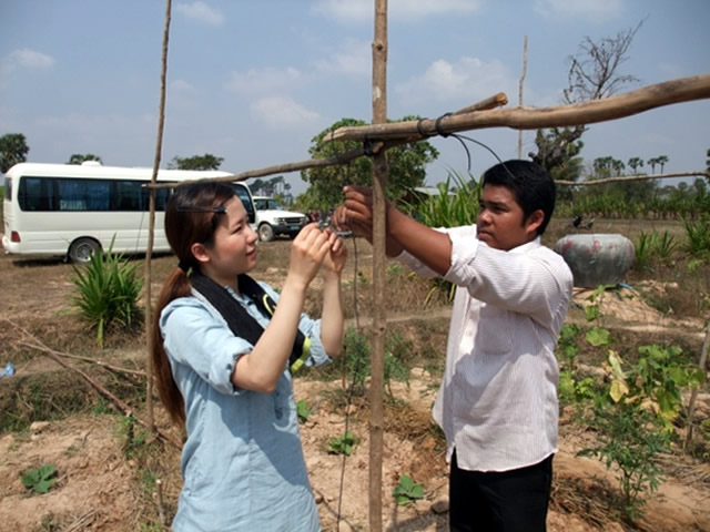 さて、こうした乾季の暑い中、JVCの支援者であるあおぞらプロジェクトさんが企画したスタディーツアーを受け入れた。参加者は17名と大所帯で、JVC試験農場でカンボジア流農業!?を体験してもらった。体験してもらった作業は、野菜への水やり、トマトの支柱作り、肥料作りなど。機械を使わないので全て手作業で行った。
