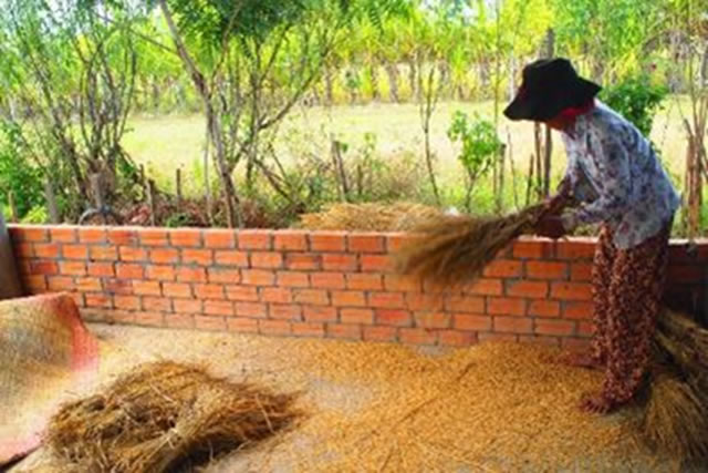 刈った後の稲は束にしてまとめ、軽く乾燥させて後に脱穀(穂をとる作業)をします。この作業がなかなか衝撃的。なんと、わらの端を持って壁に叩きつけるのです。力の限り。イチローばりのスイングで豪快に穂を落とします。これも機械ですべてやってしまう日本では見られない光景です。この光景を想像していただければ分かると思いますが、あちらこちらに穂が飛び散ります。散らばった穂をすべて回収できるはずもないのでここでもムダが出てしまいます。カンボジアでも、脱穀は業者に頼んで機械を使って行っている農家も増えてきているそうです。お金は多少かかりますが、収穫したコメのムダは手作業よりも確実に減らせるでしょう。栽培技術だけではなく、ポストハーベスト技術の改善によっても収量を上げることが出来ます。