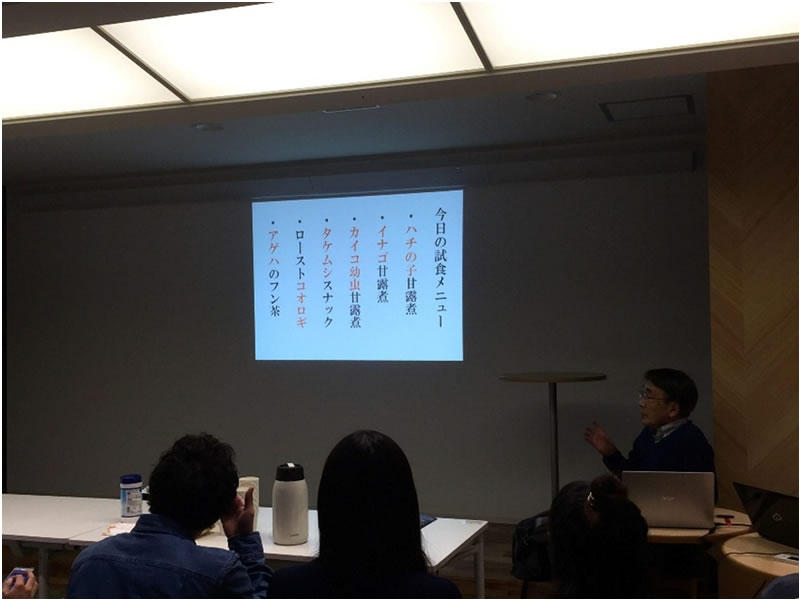 このクラウドファンディングの応援企画として、昆虫食業界の大御所・内山昭一先生と小田急電鉄株式会社さんのご協力のもと、開催したのが【初心者向け】美味しい虫の食べ方講座。あっという間に定員となり、日本の昆虫食人気の高まりを感じた次第です。内山先生の分かりやすいレクチャーを聞いた後で、当日のメニューはこちら。