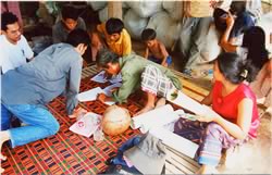 ■活動対象地域の農村で、漁業共同組合とは 何かを村の人に説明し、既に組合のある村への 視察を検討しているようす。 |