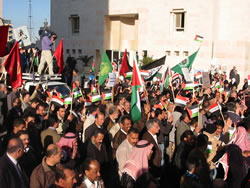 ヨルダンではほとんどの場合デモが認められないのだが、この日は特別だ。シュメサーニ地区には、5000人の人たちがプラカードなどをもってやってきた。ゲバラTシャツを着た人たちとか、赤旗を振っている共産主義者。そして、コーランをかざすムスリム同胞団の人たち。本来まったく相容れない人たちが一緒になってデモをしている。