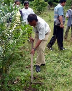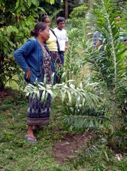 その後、30分程離れた村の働き者ノンさん夫婦の畑を訪問しました。ノンさんは国道沿い付近に広大な農地を持ち、夫婦だけでラタン植栽を行なって4年の経験があります。ツアー一行が到着した時には丁度昼寝時で、慌てて起きて、皆が座れる場所を作ってくれました。数百株のラタンが背丈近くに成長しているノンさんの農地を見たツアー参加者たちは、ノンさんを囲んで早速、質問し始めました。ノンさんは少し寝ぼけ眼ながらも、栽培方法や販売について答え活発な交流となりました。ノンさんは、種を収集して発芽させることはしていないと言い、以前に研修で学んだことがある参加者が、逆にノンさんに発芽手法を教えるなど、お互いの情報交換ともなりました。