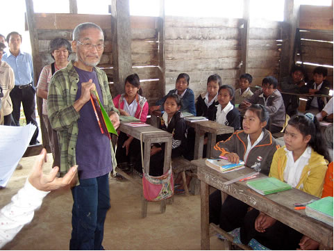 ラオスの森の活動を支援し続けている地球の木がラオスの村を訪問し、森の交流を行った。今回は、絵本作家の田島征三氏も同行し、小学生に木の実を使った絵本の紹介をするとともに、村人と一緒に森を歩き、森の中にある木の実や虫など様々な「あるもの」探しをした。その後で、魚保護エリアで昼食を村人と一緒に食べて交流を行った。