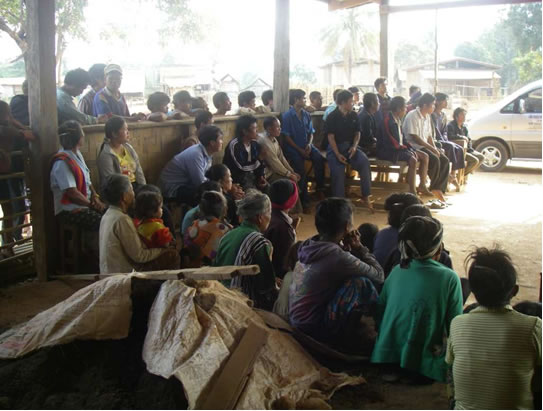 1月から開始したカレンダーを使用した法律研修を継続し、今月はピン郡の5村で実施した。とりわけ、前週にPLUPを行ったばかりのH村では60名以上の村人が参加し、様々な法律や権利についての我々の研修に耳を傾けた。この村は少数民族の村だが、村の長老格の男性たちからの質問には、夫婦での共同での土地所有についてのものがあった。この村では、伝統的には土地所有は男性のものだった。ラオスの法律は男女平等を謳っているとはいえ、とりわけ少数民族の村ではこれは極めて新しい概念である。研修の中で、グレンはオーストラリアの例を出して、夫婦で一つの土地を共同所有は普通なことであると説明した。村の年配男性の中にはこのような新しい考え方に慣れるのに時間がかかるかも知れないが、村の女性たちはみなこの考え方を素晴らしいものととらえたようだった。 また、このカレンダーを使用した研修に加えて、N村の学校 で森林の大切さや村の暮らしにとっての自然資源保護の大切 さについて話す活動も行った。