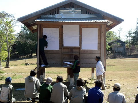 H村は、村内にゴムを植林する植林会社との間に、様々なトラブルを抱えている。参加型土地利用計画のアプローチは、問題解決のために試してみるに値する方法であり、村人が自分たちの置かれている状況を理解し、未来に向けて村の森林地域を管理する手助けになる。JVCは、村での参加型土地利用計画を実施すると共に、ビエンチャンから講師を招き、地域の行政官への新しい参加型土地利用計画の方法に関する研修を請け負ってもらった。週の終わりには、参加型土地利用計画は大部分完了したが、隣接する1村は、村境の設定への合意に至らなかったため残される結果となった。また、植林会社の植林地域に関しては、明白に地図に描く必要がいまだに残っている。これらの実施に関しては、我々の今後の計画としている。