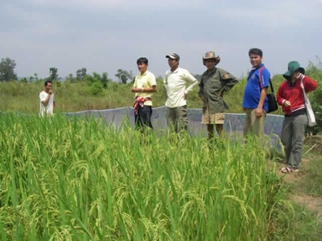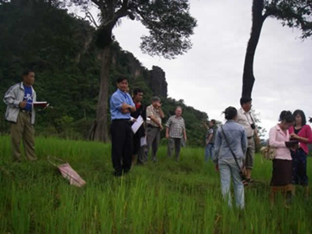 11月から始まる刈り入れを前に、雨季作経験交流を実施。実践者が8村10名と小規模だった昨年 の同時期は、その中から最も生育のよい田を選び、そこに他の村から多くの農家が訪れる形の経験交流を実施した。それに対し、15村62名の実践者となった今年は、実践者のいる村では、各村で「村内」経験交流を実施した。全ての村に「モデルSRI農家」と言えるような農家がいるわけではないが、ある程度生育の良い田は全ての村にあり、同じ村の村人が類似した条件下で取り組んでいる田を見ることで、「自分にもできるかな」と感じてもらうことを意図した。JVCラオスは、村人が完璧なSRIを実践しなくても、できる範囲で、やりやすい形で取り入れることで、できるだけ広くSRIを普及させたいと考えている。実践者のまだいない村については、実践者のいる村にまとまって訪れる従来の形の経験交流を実施した。