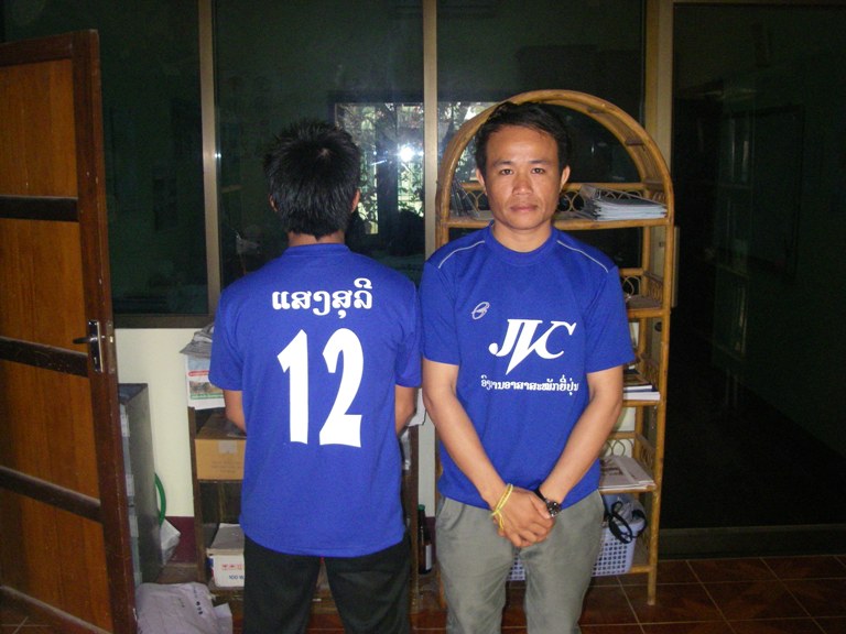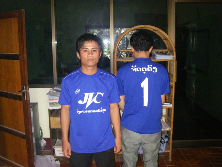 ご覧の通りのサッカーユニフォーム風。デザインは私がした。SEAゲーム(東南アジアゲーム)でのラオス人の熱狂振りを見て、これはサッカーユニフォームかな、と思い立ち、理由は秘密にしつつ全員の好きな番号を聞いた。評判は悪くない模様(まあ、気に入らないと表立って言う人もいなかろうが)。個人的にはサッカーのことは全然わからないのだが、格闘技が好きだからといってまさかJVCトランクスというわけにもいかないので、これでよかったのでしょう。